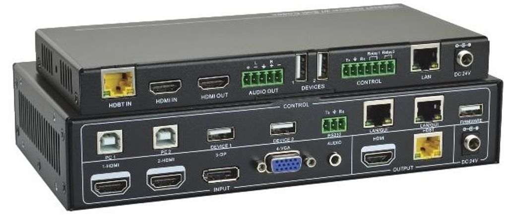 Collaborating with PC-based conferencing codecs , such as Skype, WebEex, GoToMeeting etc. It includes a transmitter with 4 inputs (2 HDMI, 1 DP, 1 VGA) and 2 mirrored output (1x HDMI, 1 HDBT), a receiver with 1 HDBT and 1 local HDMI input and 1 HDMI output,to provide a complete AV switching, USB and HDMI extension, and integrated system control for meeting rooms.